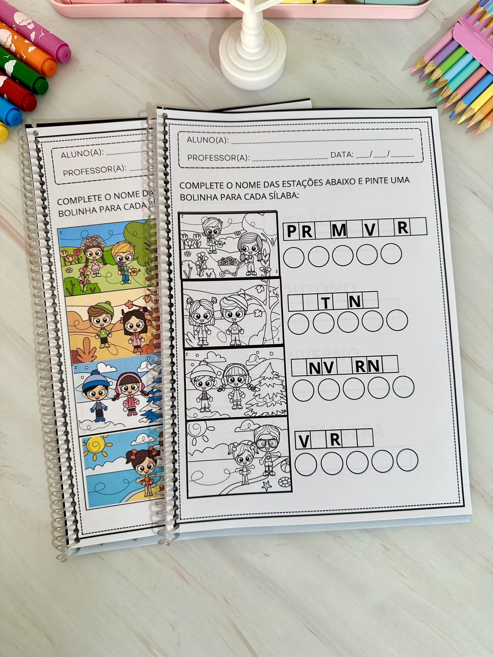 Conteúdos abordados: Estações do ano Leitura Recorte e colagem Pintura Vogais Consciência silábica