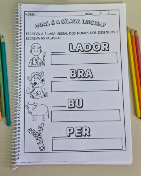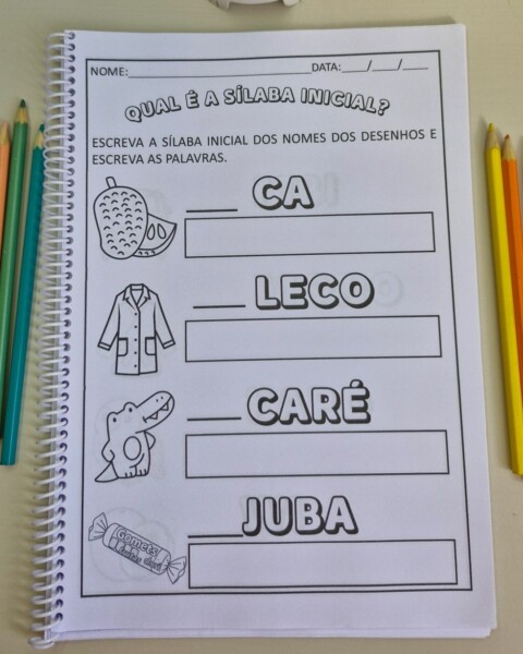As crianças observam as figuras, completam as palavras e descobrem as sílabas iniciais de cada nome. Ideal para turmas de alfabetização!