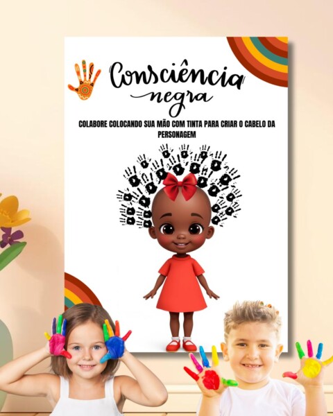 Pinte as mãozinhas de tinta e crie o cabelo da personagem no Painel ampliado de 16 folhas A4 e trabalhe esse tema tão importante♥